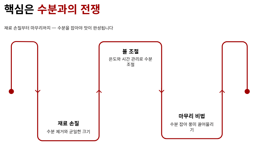 - 처음부터 끝까지 센 불을 유지하여 수분 발생을 최소화해야 합니다.