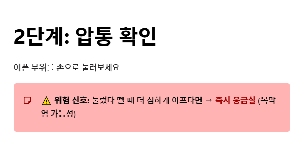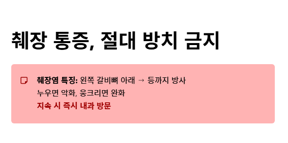 - 왼쪽 갈비뼈 아래 통증과 함께 고열, 구토, 극심한 압통이 있다면 즉시 병원을 방문하세요.