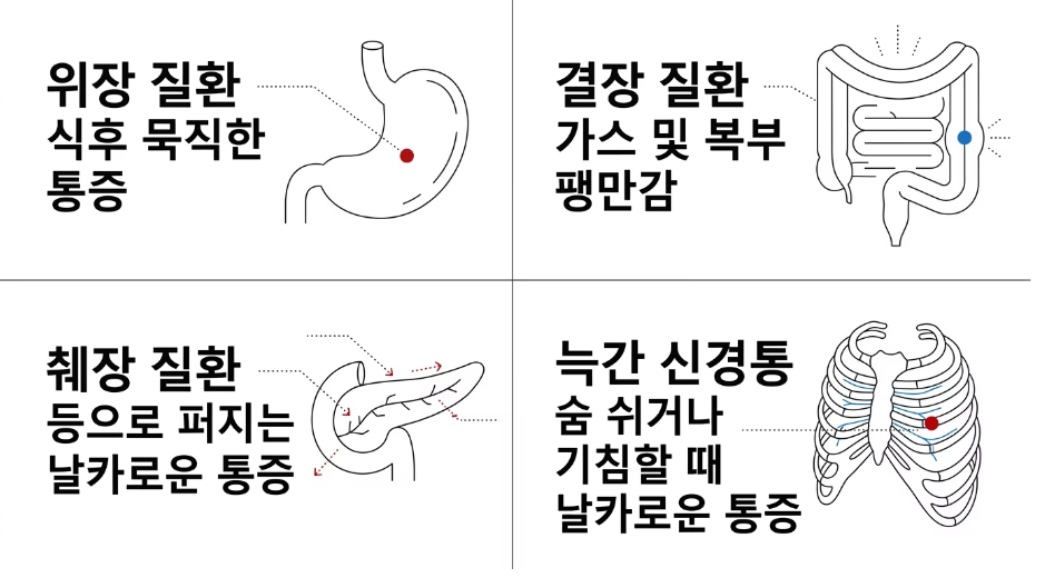 - 등까지 뻗치는 날카로운 통증 (췌장 질환): 췌장은 몸속 깊숙이 위치해 있어 염증이 생기면 왼쪽 갈비뼈 아래부터 등 뒤쪽까지 통증이 방사됩니다. 누워 있을 때 심해지고 몸을 웅크리면 완화된다면 주의 깊게 살펴야 할 왼쪽 갈비뼈 아래 통증 신호입니다.