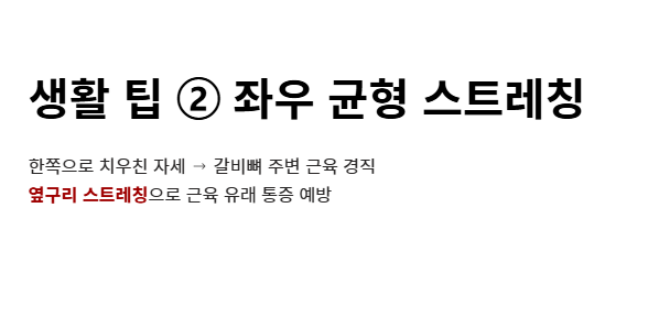 - 좌우 균형 잡힌 스트레칭: 한쪽으로 치우친 자세는 갈비뼈 주변 근육을 경직시킵니다. 옆구리를 늘려주는 가벼운 스트레칭은 근육 유래 왼쪽 갈비뼈 아래 통증 예방에 효과적입니다.