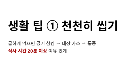 - 천천히 씹어 먹는 습관: 급하게 먹으면 공기를 함께 삼켜 대장에 가스가 차게 되고, 이는 곧 왼쪽 갈비뼈 아래 통증으로 이어집니다. 식사 시간을 20분 이상 여유 있게 가지세요.