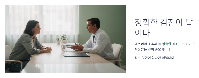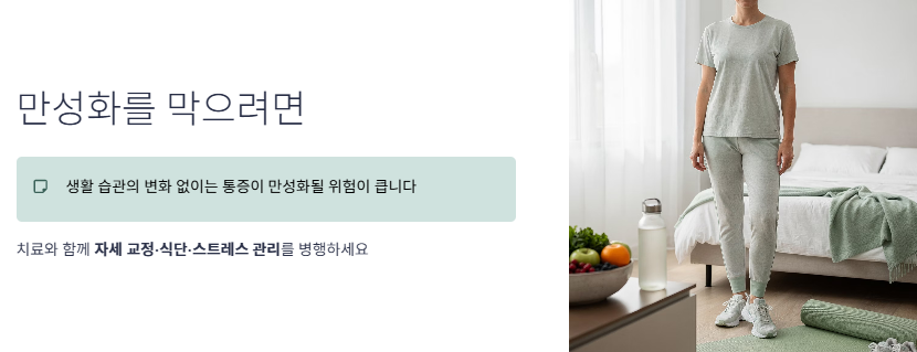 - 생활 습관의 변화 없이는 통증이 만성화될 위험이 큽니다.