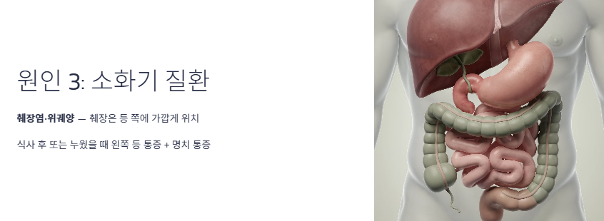 - 소화기 질환 (췌장염 및 위염): 췌장은 등 쪽에 가깝게 위치한 장기입니다. 식사 후나 누웠을 때 왼쪽 등쪽 통증이 심해지고 명치 부근까지 아프다면 췌장의 염증이나 위궤양을 의심해 볼 수 있습니다.