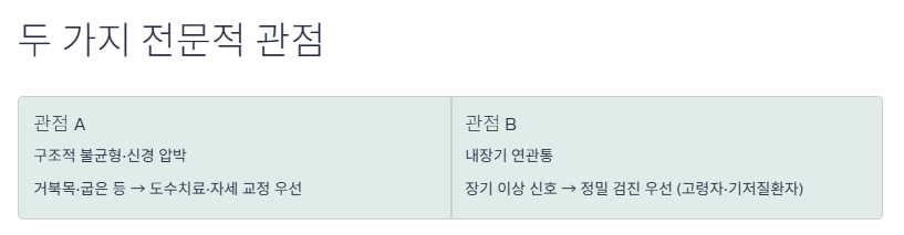 전문가들 사이에서도 등의 통증을 해석하는 우선순위에 따라 다음과 같은 시각차가 존재합니다.