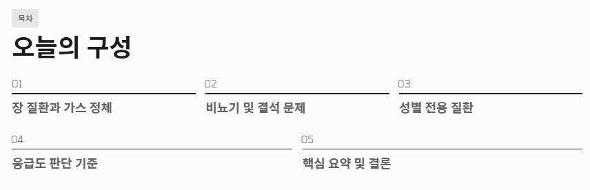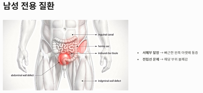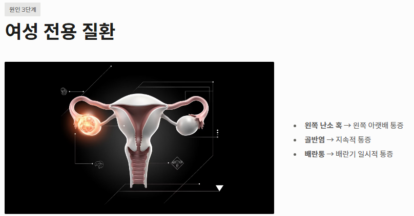 - 성별 차이: 여성은 난소 질환, 남성은 탈장 여부를 왼쪽 아랫배 통증과 연결해 체크해야 합니다.