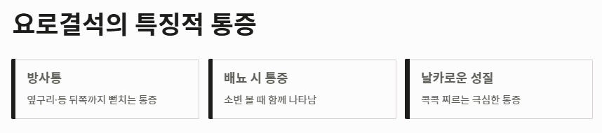 소변이 지나가는 통로인 요관에 돌이 생기는 요로결석 역시 날카로운 왼쪽 아랫배 통증을 유발합니다. 이때의 왼쪽 아랫배 통증은 옆구리나 등 뒤쪽까지 뻗치는 방사통으로 이어지는 경우가 많으며, 배뇨 시 통증이 함께 나타나기도 합니다.
