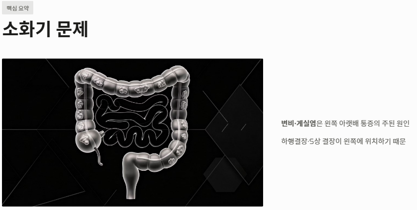 - 소화기 문제: 변비나 게실염은 왼쪽 아랫배 통증의 주된 원인입니다.