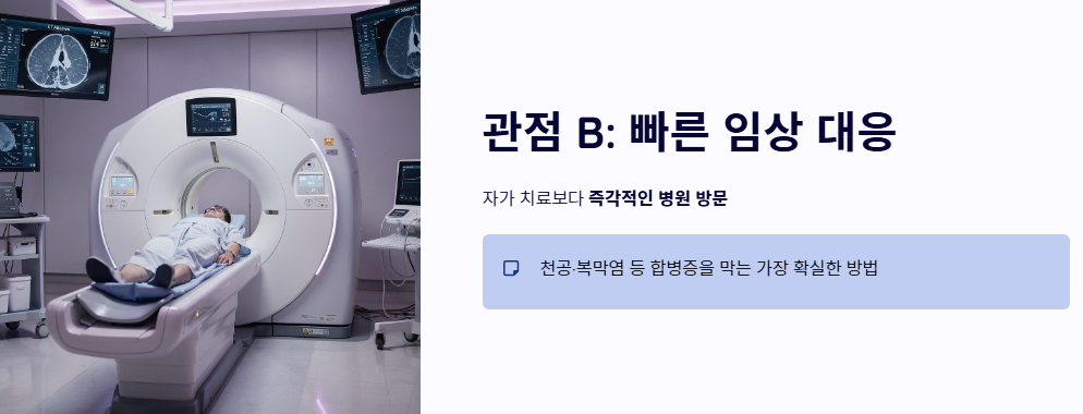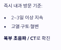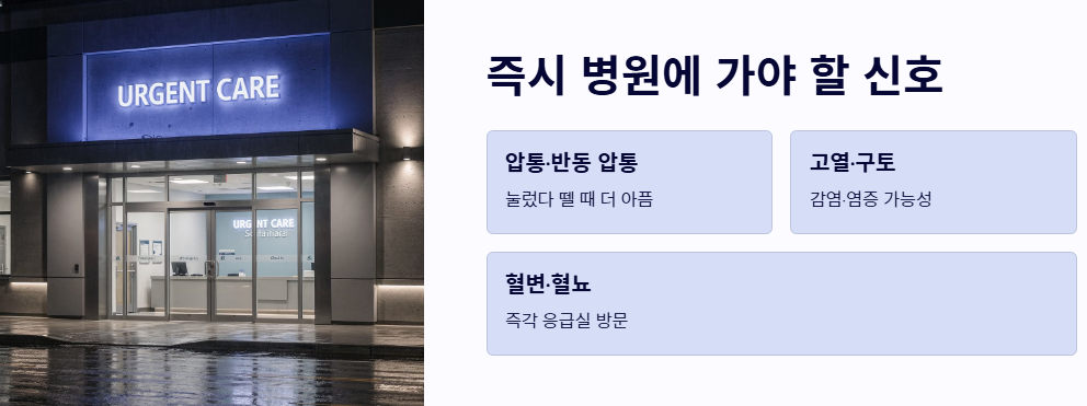 - 눌렀을 때의 통증(압통)이나 반동 압통이 있다면 즉시 응급실이나 병원을 찾아야 합니다.