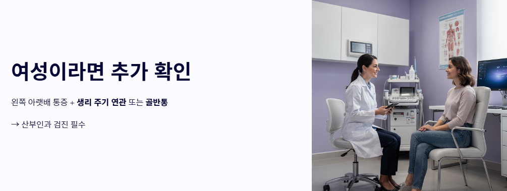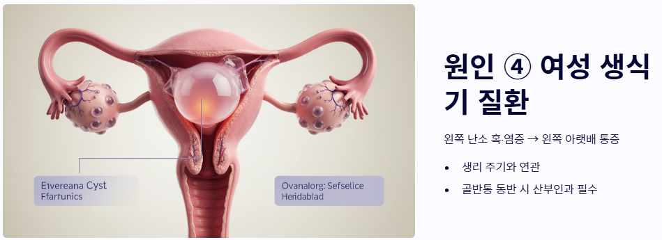 - 여성 생식기 질환 (난소낭종 등): 여성의 경우 왼쪽 난소에 혹이 생기거나 염증이 있을 때 왼쪽 아랫배 통증을 느낍니다. 생리 주기와 관련이 있거나 골반통이 동반된다면 산부인과적 검진이 필요합니다.