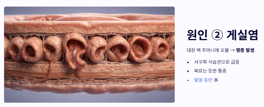 - 게실염 (대장 염증): 대장 벽의 일부가 주머니처럼 튀어나온 곳에 오물이 들어가 염증이 생기는 질환입니다. 서구화된 식습관으로 최근 급증하고 있으며, 찌르는 듯한 왼쪽 아랫배 통증과 함께 발열이 동반되는 경우가 많습니다.