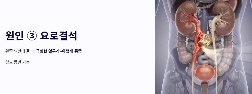 - 관점 B: '해부학적 구조와 급성 염증' 중심의 임상적 접근 게실염이나 요로결석처럼 구조적인 결함이나 감염에 집중합니다. 자가 치료보다는 빠르게 병원을 찾아 영상 의학적 검사를 받는 것이 왼쪽 아랫배 통증으로 인한 합병증(천공, 복막염 등)을 막는 지름길이라는 시각입니다.