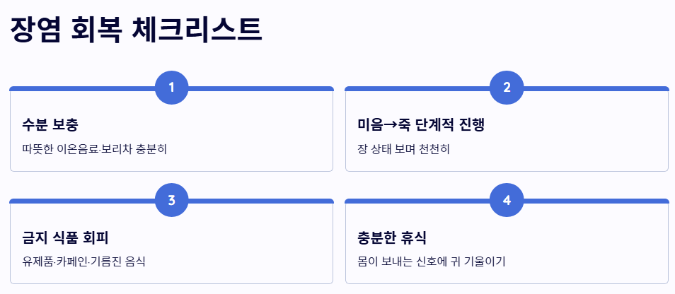 오늘 상세히 살펴본 장염에 좋은 음식과 관리법의 핵심 내용을 정리합니다.