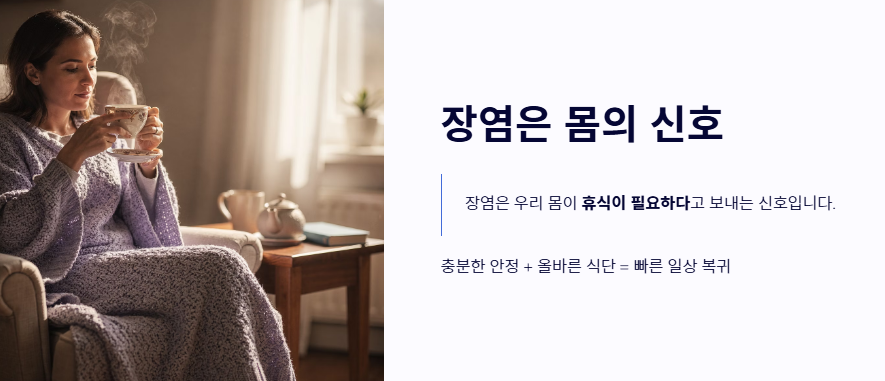 - 본인의 증상 정도에 따라 절식 혹은 소량의 장염에 좋은 음식 섭취를 선택합니다.