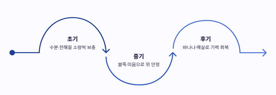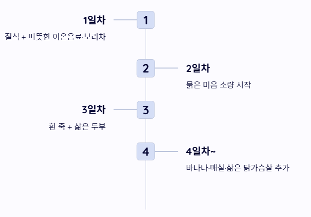 구토나 설사가 심한 직후에는 1~2끼 정도 절식하며 장에 휴식을 줍니다. 이후 허기가 느껴질 때 아주 묽은 미음부터 시작하여 음식에 대한 적응력을 높여야 합니다.