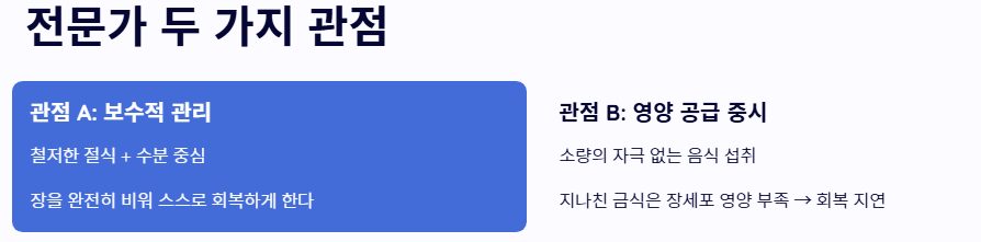 전문가들 사이에서도 장염 시 식사 요령에 대해 다음과 같은 서로 다른 강조점을 두기도 합니다.