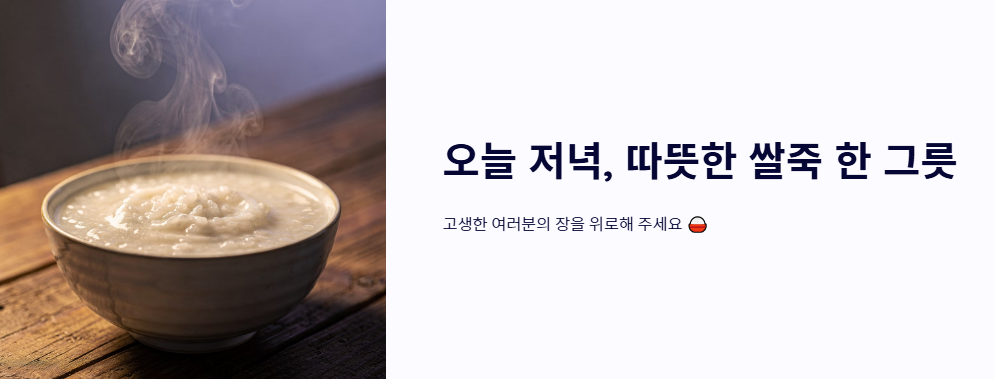 - 중기: 자극 없는 에너지원 (쌀죽과 미음) 증상이 조금 가라앉으면 흰 죽이나 미음으로 탄수화물을 보충합니다. 쌀은 소화 부담이 적고 장 점막을 부드럽게 감싸주는 대표적인 장염에 좋은 음식입니다. 이때 기름진 반찬이나 자극적인 양념은 철저히 배제해야 합니다.