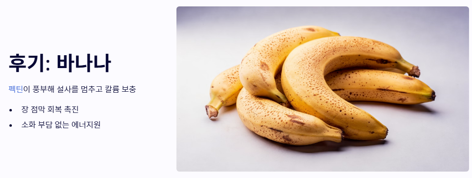 - 후기: 장 점막 회복과 기력 보충 (바나나와 매실) 바나나는 펙틴이 풍부해 설사를 멈추게 하고 칼륨을 보충해 주는 훌륭한 장염에 좋은 음식입니다. 또한, 매실액을 물에 타 마시면 살균 작용과 함께 소화 기능을 돕는 효과적인 장염에 좋은 음식 역할을 합니다.