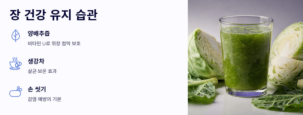 - 양배추의 활용: 비타민 U가 풍부한 양배추는 위장 점막을 보호합니다. 증상이 호전된 후 양배추즙이나 삶은 양배추를 꾸준히 먹는 것은 장 건강을 지키는 장염에 좋은 음식 습관입니다.