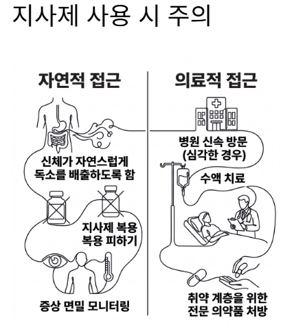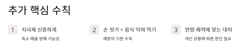 - 지사제 사용은 독소 배출을 방해할 수 있으므로 신중해야 합니다.