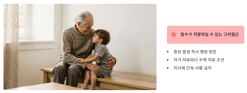 - 탈수 증상이 나타나면 지체 없이 수액 치료 등 의학적 도움을 받아야 합니다.