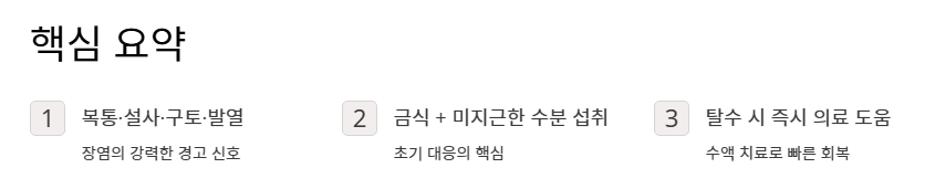 오늘 상세히 살펴본 장염 증상의 핵심 내용을 정리합니다.