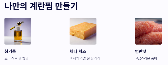 - 참기름 한 방울: 조리 직후 참기름을 살짝 떨어뜨리면 고소한 향이 식탁 가득 퍼지는 전자렌지 계란찜 맛있게 하는법이 됩니다.