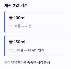 - 계란과 물의 비율은 최소 1:1 이상으로 맞춥니다.