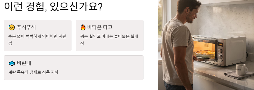 "바쁜 아침, 가스불 앞에 서서 냄비를 저을 시간조차 없을 때 가장 먼저 생각나는 메뉴는 무엇인가요? 하지만 야심 차게 돌린 전자레인지 계란찜이 푸석푸석하거나 바닥은 타고 위는 설익어 실망했던 경험, 한 번쯤은 있으실 겁니다."