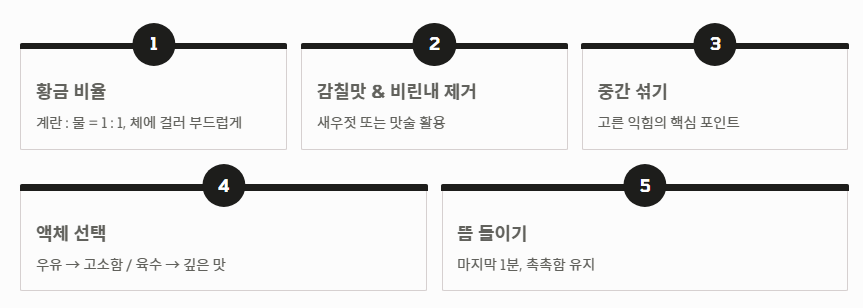 - 채소 활용: 당근, 쪽파를 잘게 다져 넣으면 시각적으로도 훌륭하고 영양가도 높아집니다.