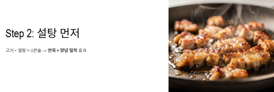 고기를 팬에 먼저 올리고 설탕 1~2큰술을 넣어 먼저 볶으세요. 설탕의 분자가 고기 입자에 먼저 침투해 연육 작용을 돕고, 나중에 넣을 양념이 겉돌지 않게 잡아주는 제육볶음 맛있게 만드는법의 핵심 비결입니다.