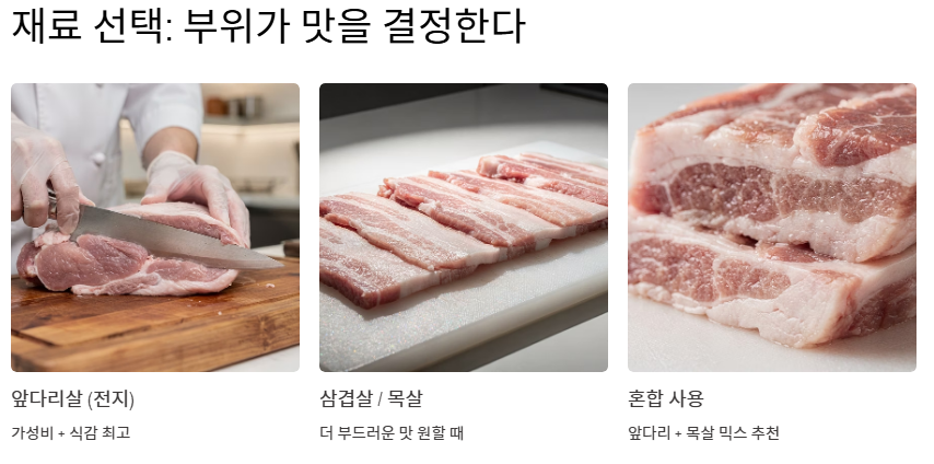 - 부위 선정: 가성비와 식감을 모두 잡으려면 돼지 앞다리살(전지)이 가장 좋습니다. 적당한 지방과 살코기의 조화가 부드러운 제육볶음 맛있게 만드는법의 핵심입니다. 더 부드러운 맛을 원한다면 뒷다리살보다는 삼겹살이나 목살을 섞어 사용하는 것도 방법입니다.