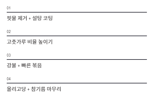 - 고추장보다 고춧가루 비율을 높여 텁텁하지 않고 칼칼한 맛을 냅니다.