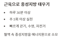 근육을 사용해 혈액 속의 중성지방을 에너지원으로 태워 없애야 합니다. 하루 30분 이상의 빠르게 걷기, 수영, 자전거 타기 등 유산소 운동을 주 5회 이상 실천하면 중성지방 정상수치 안착에 매우 효과적입니다.