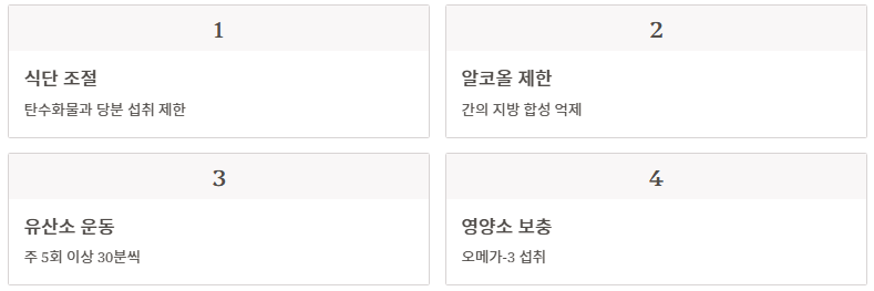 - 해결: 당류 섭취 줄이기, 절주, 유산소 운동, 그리고 오메가-3 섭취가 권장됩니다.