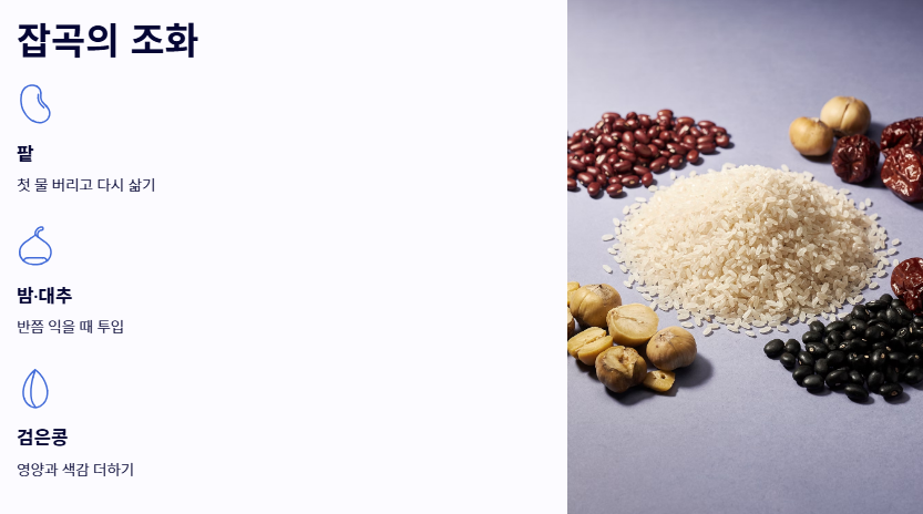 - 잡곡의 조화: 팥, 밤, 대추, 검은콩 등을 준비하세요. 팥은 미리 삶아 첫 물을 버리고 다시 삶아야 배앓이를 방지하고 깔끔한 찰밥 맛있게 하는법을 완성할 수 있습니다.