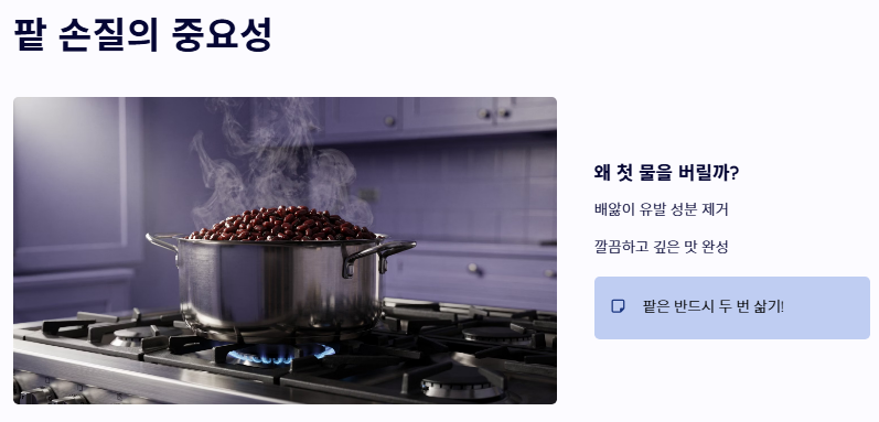 - 팥은 첫 물을 버리고 삶아 독성을 제거한 뒤 사용합니다.