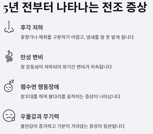- 후각 저하·렘수면장애·변비가 몇 년 전부터 있었다면 더 확률 높음