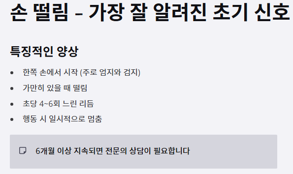 | 떨림 속도 | 느림(4~6Hz) | 빠름(8~12Hz) | 불규칙 |