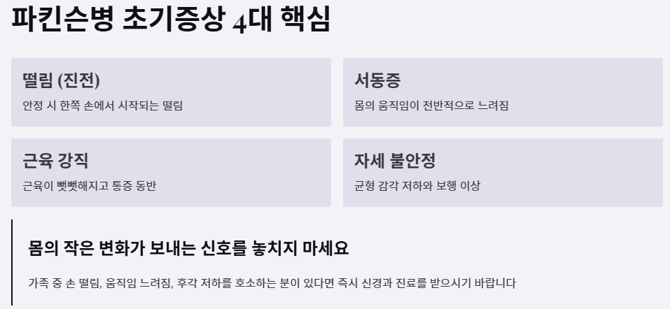 파킨슨병 초기증상의 4대 핵심은 떨림(진전), 서동증(느려짐), 근육 강직, 자세 불안정입니다. 여기에 후각 저하, 렘수면장애, 변비, 우울감 같은 전조 증상이 동반되면 더욱 의심해야 합니다.