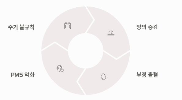 - 주기의 불규칙성: 생리 주기가 20일 이내로 짧아지거나, 반대로 두세 달씩 건너뛰는 것은 가장 흔한 증상입니다.