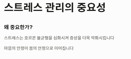 - 관리: 기록을 생활화하고 영양 균형을 맞추며 정기 검진을 통해 폐경기 생리증상의 이상 유무를 확인하세요.