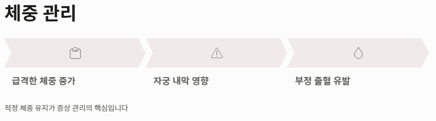 스트레스는 호르몬 불균형을 심화시켜 증상을 더욱 악화시킵니다. 또한 급격한 체중 증가는 자궁 내막 건강에 영향을 주어 폐경기 생리증상 중 하나인 부정 출혈을 유발할 수 있으므로 적정 체중 유지가 중요합니다.