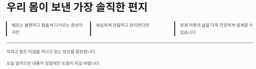 결론적으로 폐경기 생리증상은 우리 몸이 보낸 가장 솔직한 편지입니다. 때로는 불편하고 힘들게 다가오는 폐경기 생리증상이지만, 이를 세심하게 관찰하고 관리한다면 완경 이후의 삶을 더욱 건강하게 설계할 수 있습니다. 지치고 힘든 폐경기 생리증상의 터널을 지나고 있는 당신을 응원합니다. 오늘 알려드린 내용이 여러분의 폐경기 생리증상 극복에 실질적인 도움이 되길 바랍니다.