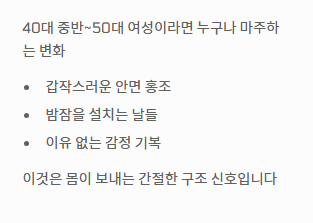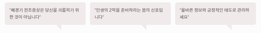 - 결론: 폐경기 전조증상은 당신을 괴롭히기 위한 것이 아니라, 인생의 2막을 준비하라는 몸의 메시지입니다.