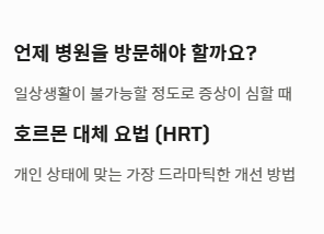 일상생활이 불가능할 정도로 폐경기 전조증상이 심하다면 산부인과를 방문해야 합니다. 개인의 상태에 맞는 호르몬 대체 요법(HRT)은 폐경기 전조증상을 가장 드라마틱하게 개선할 수 있는 의학적 방법입니다.