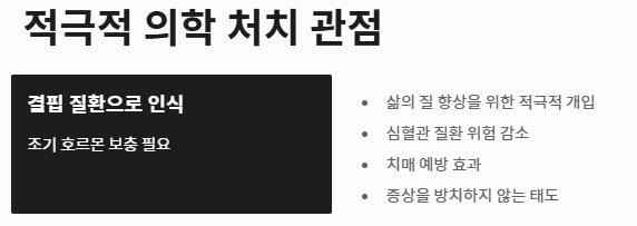 - 적극적 의학 처치 관점 (호르몬 요법 중시): 이 관점에서는 폐경기 전조증상을 단순한 자연 현상이 아닌 '결핍 질환'으로 봅니다. 삶의 질을 떨어뜨리는 폐경기 전조증상을 방치할 경우 심혈관 질환이나 치매 위험이 높아지므로, 조기에 호르몬을 보충하여 적극적으로 폐경기 전조증상을 다스려야 한다고 강조합니다.