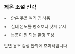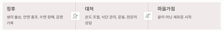 - 대처: 온도 조절, 식물성 에스트로겐 섭취, 운동, 전문의 상담을 통한 맞춤 관리.