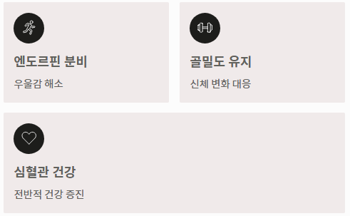 운동은 엔도르핀 분비를 촉진하여 폐경기 전조증상 중 하나인 우울감을 해소하고, 골밀도를 유지하여 신체 변화에 유연하게 대응하게 합니다.