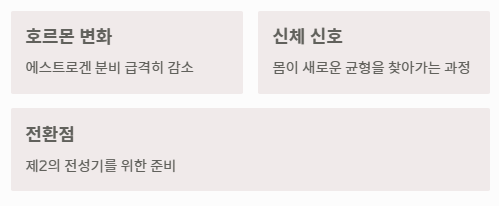 - 징후: 생리 불순, 안면 홍조, 수면 장애, 감정 기복 등이 대표적인 폐경기 전조증상입니다.
