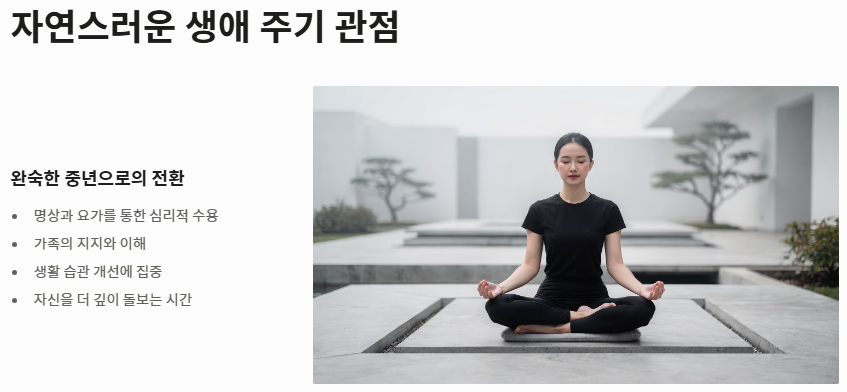 - 자연스러운 생애 주기 관점 (심리적 수용 중시): 반면, 폐경을 여성성의 상실이 아닌 완숙한 중년으로 넘어가는 자연스러운 과정으로 보아야 한다는 시각도 있습니다. 이들은 인위적인 약물보다는 명상, 요가, 가족의 지지를 통해 폐경기 전조증상을 심리적으로 수용하고 생활 습관을 개선하는 데 더 큰 가치를 둡니다. 이들에게 폐경기 전조증상은 자신을 더 깊이 돌보라는 몸의 신호입니다.